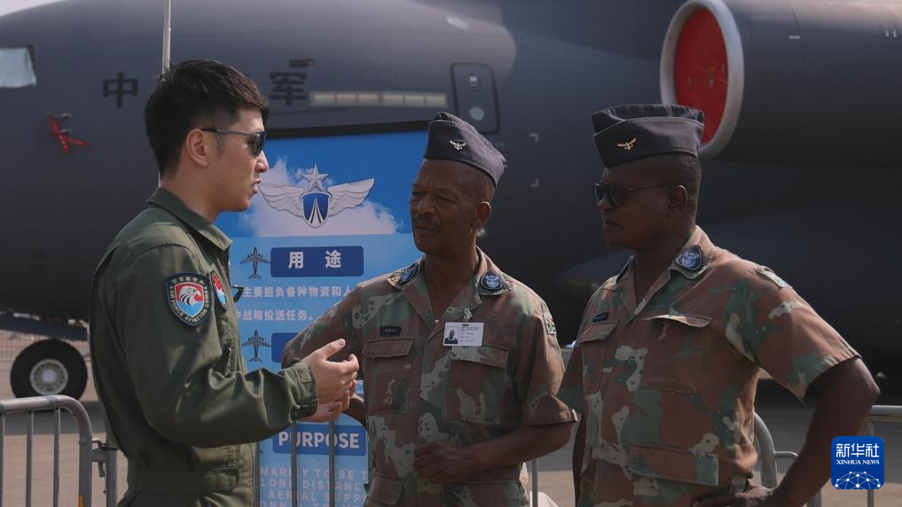 9月18日,中國空軍運-20機組成員在南非首都比勒陀利亞的非洲航空航天與防務(wù)展上向外國友人進(jìn)行介紹。新華社發(fā)(王銳杰攝)
