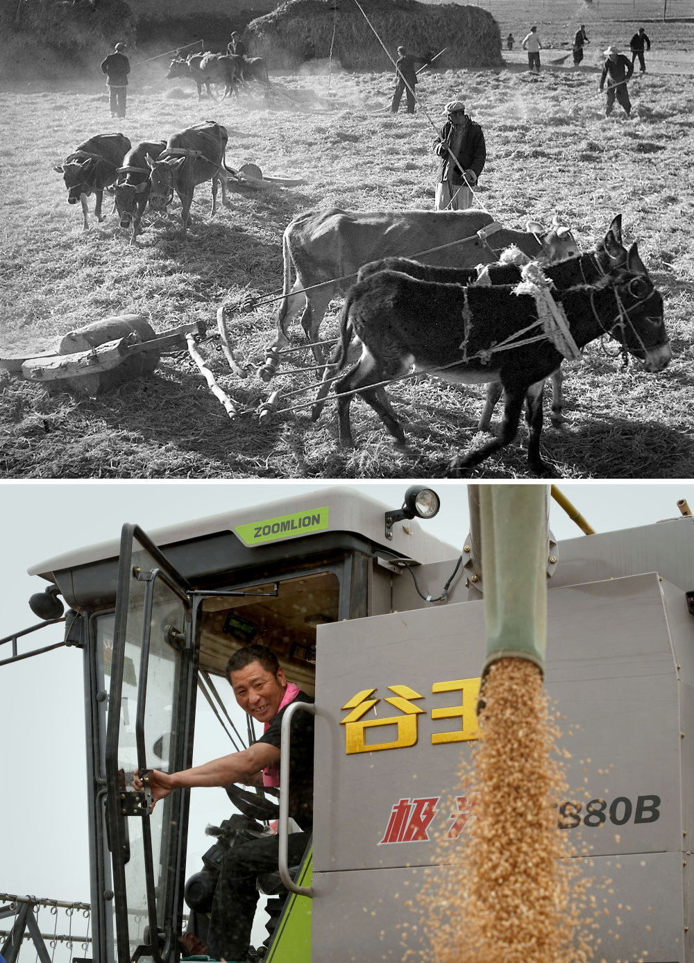 拼版照片:上圖為1965年,河南林縣(現(xiàn)林州市)上陶大隊第四生產(chǎn)隊的社員在碾麥打場(新華社記者 楊丙文 攝);下圖為2020年5月29日,在河南商水南陵村的一處麥田里,一位“麥客”將收割脫粒后的小麥直接裝車(新華社記者 李安 攝)。