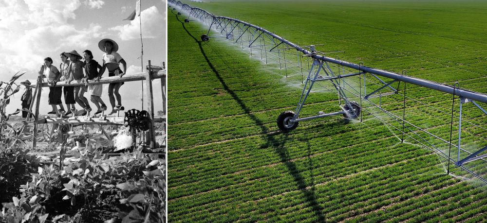 拼版照片:左圖為20世紀(jì)50年代,河南郾城萬金公社社員在踩水車澆田(魏德忠 攝);右圖為2017年3月9日,在河南浚縣王莊鎮(zhèn)一處麥田里,自走式智能噴灌機在進行噴灌作業(yè)(新華社記者 李安 攝)。