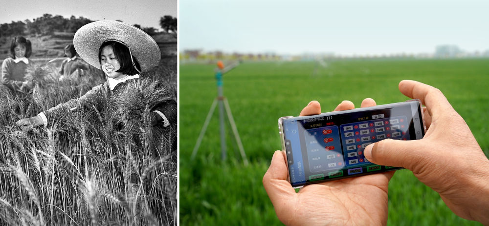 拼版照片:左圖為1961年,河南新縣陡山河鄉(xiāng)的技術(shù)員在進行田間調(diào)查,確定小麥選種地塊(新華社記者 張青云 攝);右圖為2021年4月14日,在河南商水一處高標(biāo)準(zhǔn)農(nóng)田里,種糧大戶邱守先使用手機操控設(shè)備對小麥田進行自動噴灌(新華社記者 李安 攝)。