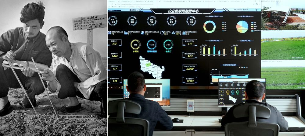 拼版照片:左圖為20世紀(jì)50年代,河南滎陽廣武農(nóng)業(yè)社社員在測量、記錄地溫(謝延華 攝);右圖為2021年4月14日,工作人員在河南商水農(nóng)業(yè)物聯(lián)網(wǎng)控制中心內(nèi)工作(新華社記者 李安 攝)。