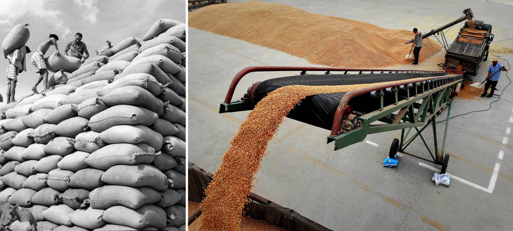 拼版照片:左圖為1959年,河南黃泛區(qū)農(nóng)場員工在堆放剛收打的小麥,準(zhǔn)備入倉(新華社記者 楊震河 攝);右圖為2018年6月4日,在河南黃泛區(qū)農(nóng)場,工作人員將剛收打的小麥過篩后直接裝車,準(zhǔn)備運往糧庫(新華社記者 李安 攝)。