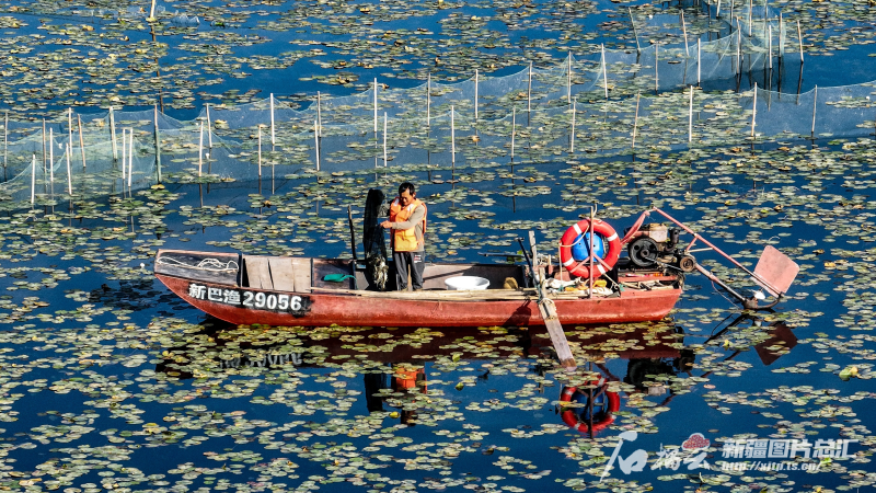 9月20日,養(yǎng)殖戶在博斯騰湖上捕撈螃蟹(無人機攝)。石榴云/新疆日報記者 周鵬攝