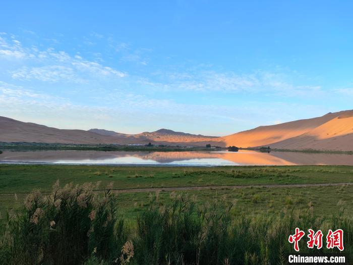 9月21日,巴丹吉林沙漠“廟海子”早晨的“湖光山色”。 中新社記者 陳溯 攝