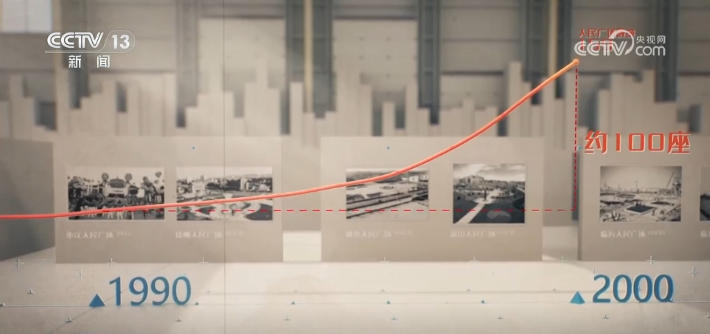 追溯歷史,將人民廣場的建設(shè)與時間線關(guān)聯(lián),我們發(fā)現(xiàn)了全國人民廣場建設(shè)的兩個重要時間節(jié)點(diǎn):在90年代,隨著城鎮(zhèn)化的步伐,更多的廣場滿足了人們對公共空間的新需求,大約有100座人民廣場在這十年間建成。2013年左右,一股新的建設(shè)浪潮出現(xiàn)在小型縣城,尤其是在剛剛擺脫貧困的地區(qū)興起,人民廣場的增量又與脫貧攻堅的進(jìn)程同步見證了一塊塊土地從貧瘠到繁榮的動人變遷。