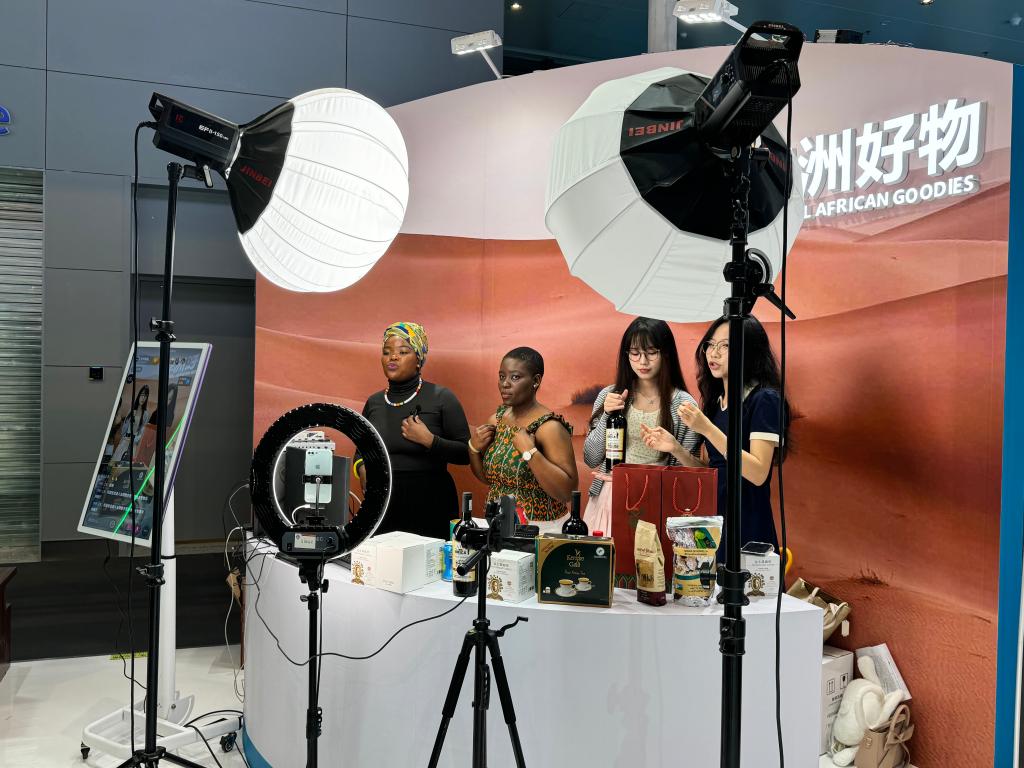南非的紅酒、埃塞俄比亞的咖啡、肯尼亞的紅茶……在“智慧非洲”展臺一角,來自南非和中國的4名大學生變身帶貨主播,通過TikTok和抖音平臺將各類“非洲好物”推廣至海內外。