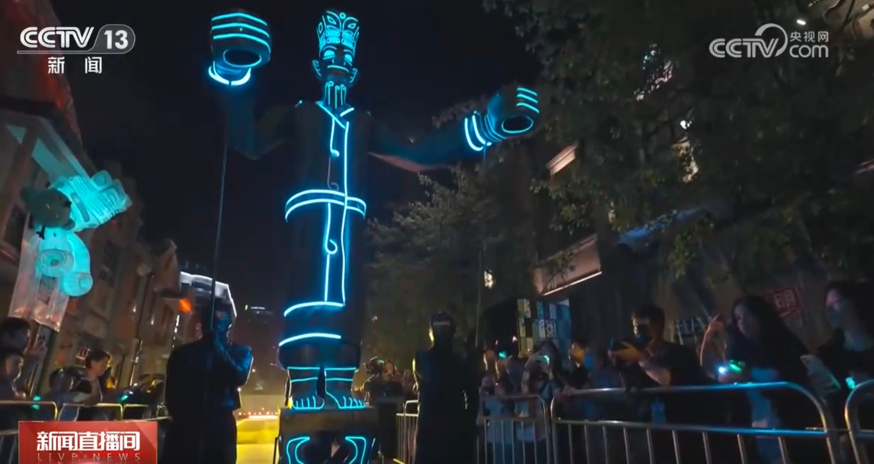 在上海張園,“三星堆奇幻嘉年華”讓夜游上海有了新去處。以三星堆文化中的文物為原型,一系列的互動(dòng)巡游裝置搭配光影效果,氛圍感拉滿。