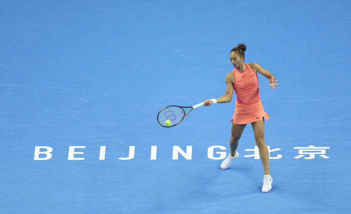 10月2日,鄭欽文在比賽中回球。當(dāng)日,在北京進(jìn)行的2024中國網(wǎng)球公開賽女子單打第四輪比賽中,中國選手鄭欽文2比1戰(zhàn)勝美國選手阿尼西莫娃,晉級八強(qiáng)。新華社發(fā)(杜昕怡攝)