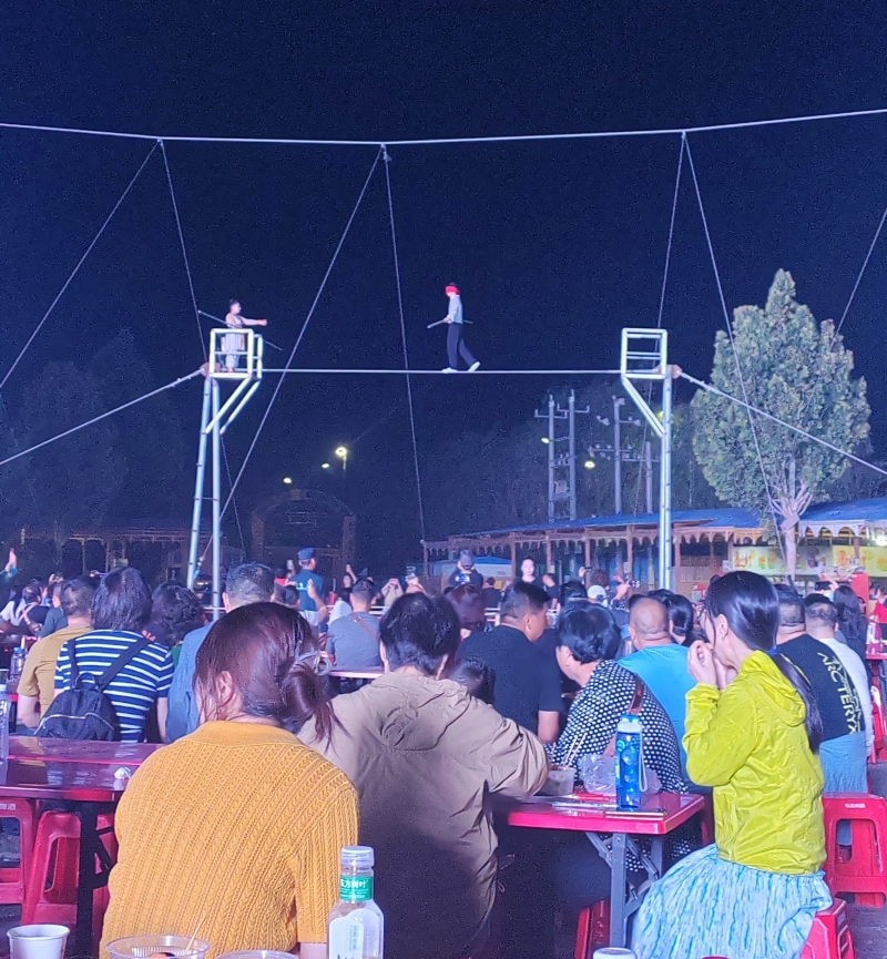 夜幕降臨,華燈初上,阿克蘇老街夜市美食與文化的融合相得益彰。特色烤包子、烤全羊、抓飯、肚包肉等美食的香氣與攤主的叫賣聲交織在一起;民族樂器、木盤、木碗、木勺等非遺產(chǎn)品,既有滄桑感,更有文化味;達(dá)瓦孜表演中,兩名演員在手持平衡桿,在高空繩索上表演前后走動(dòng)、盤腿端坐、蒙眼行走、飛身跳躍等一系列驚心動(dòng)魄的技藝,引得觀眾拍手稱絕;賽乃姆、龜茲樂舞等讓人們感受到了中華文化的魅力和深厚底蘊(yùn)。