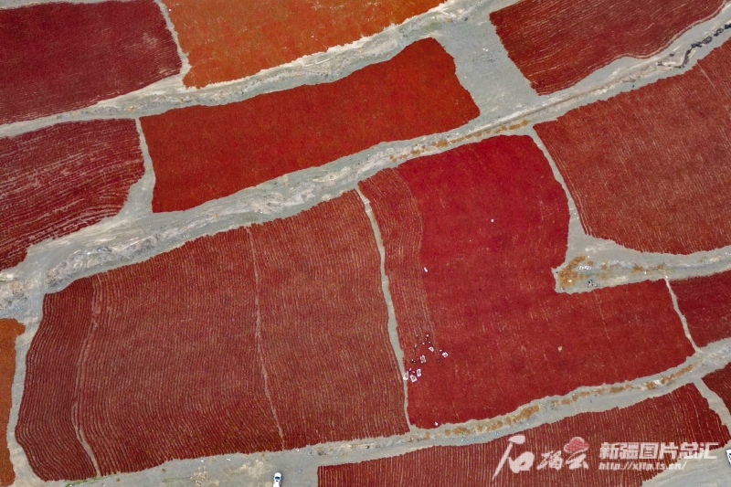 10月3日,種植戶在沙灣市安集海鎮(zhèn)萬畝天然曬場翻曬辣椒(無人機攝)。