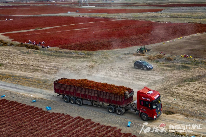 10月3日,貨運汽車在沙灣市安集海鎮(zhèn)萬畝天然曬場轉(zhuǎn)運辣椒(無人機攝)。