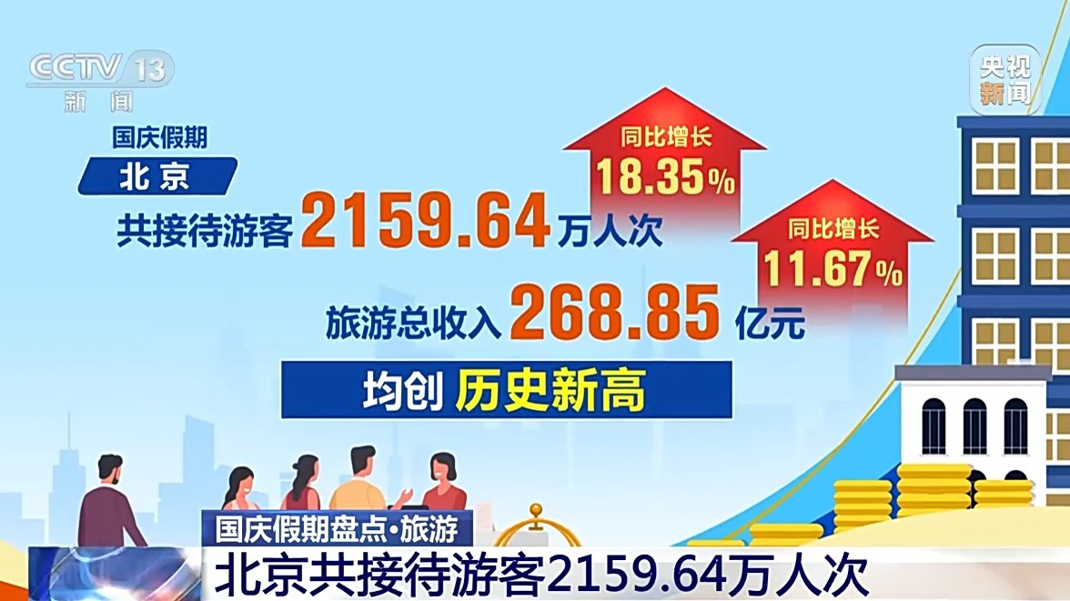 統(tǒng)計(jì)數(shù)據(jù)顯示,國(guó)慶假期,北京共接待游客2159.64萬(wàn)人次,同比增長(zhǎng)18.35%;旅游總收入268.85億元,同比增長(zhǎng)11.67%,均創(chuàng)歷史新高。文博游、北京中軸線游、京郊游、微度假游、體育賽事游、特色商圈文化街區(qū)游、花燈游、網(wǎng)紅潮玩打卡地游等受到游客青睞。