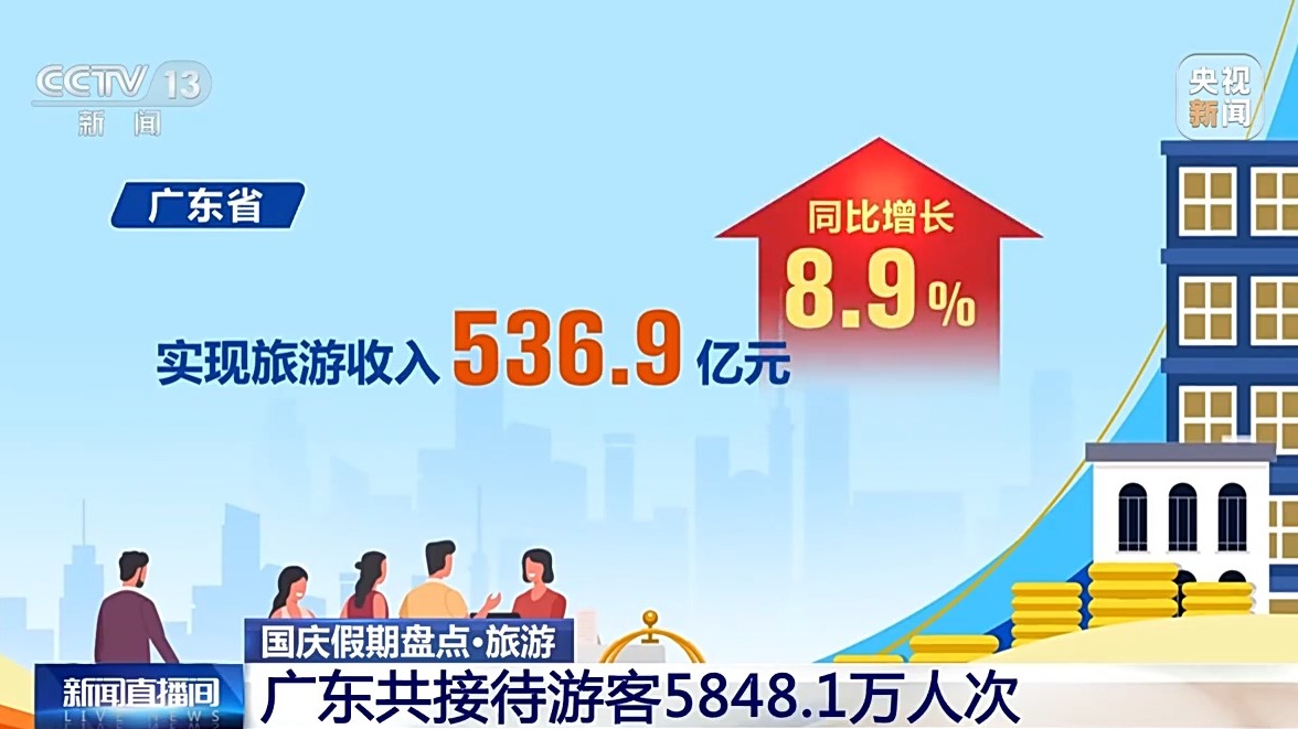 廣東省10月1日至7日累計(jì)接待游客5848.1萬(wàn)人次,按可比口徑同比增長(zhǎng)6.2%;實(shí)現(xiàn)旅游收入536.9億元,同比增長(zhǎng)8.9%。古驛道沿線重點(diǎn)區(qū)域、紅色旅游經(jīng)典景區(qū)、鄉(xiāng)村旅游點(diǎn)和歷史古村落等,成為旅游出行熱點(diǎn)。