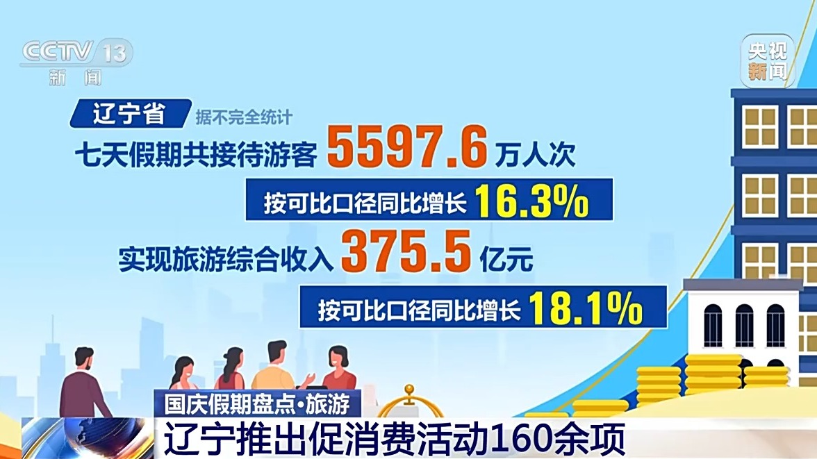 遼寧省據(jù)不完全統(tǒng)計(jì),七天假期共接待游客5597.6萬(wàn)人次,按可比口徑同比增長(zhǎng)16.3%,實(shí)現(xiàn)旅游綜合收入375.5億元,按可比口徑同比增長(zhǎng)18.1%。假期里遼寧省推出促消費(fèi)活動(dòng)160余項(xiàng),全省各地舉辦文化藝術(shù)、群眾文化、非遺、文博等各類活動(dòng)600余場(chǎng),通過(guò)線上線下聯(lián)動(dòng)的方式,豐富人們假日文化生活。