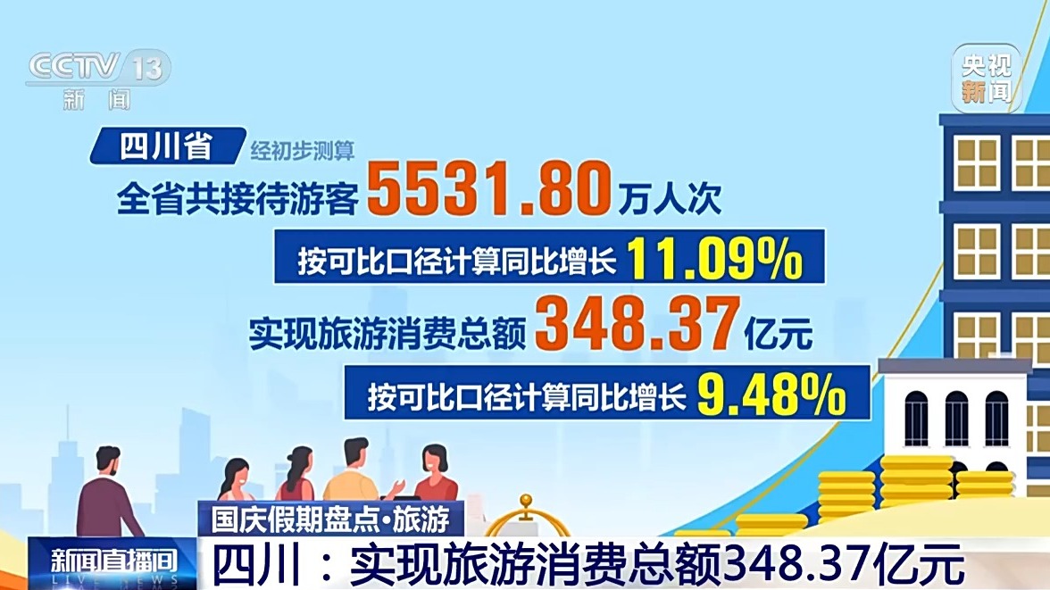 四川省經(jīng)初步測(cè)算,全省共接待游客5531.80萬(wàn)人次,實(shí)現(xiàn)旅游消費(fèi)總額348.37億元,按可比口徑計(jì)算,同比分別增長(zhǎng)11.09%和9.48%。全省核心旅游景區(qū)“狀態(tài)拉滿”,17家5A級(jí)景區(qū)累計(jì)接待游客426.93萬(wàn)人次、實(shí)現(xiàn)門票收入1.85億元,同比分別增長(zhǎng)25.06%和15.48%,超越假日歷史最高水平。九寨溝景區(qū)連續(xù)4天均達(dá)4.1萬(wàn)人承載量上限。