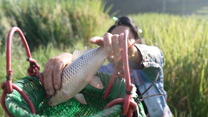 而侗族人民的智慧遠(yuǎn)不止于此,他們巧妙地利用當(dāng)?shù)刈匀画h(huán)境,孕育出獨(dú)特的“稻魚鴨”共生稻作文化。從江縣往洞鎮(zhèn)增沖種植養(yǎng)殖專業(yè)合作社負(fù)責(zé)人石剛勇說,“種植一季稻、放養(yǎng)一批魚、飼養(yǎng)一批鴨,稻魚鴨系統(tǒng)能夠和諧共存,是因?yàn)榇蛄藭r(shí)間差。種稻的時(shí)候放魚苗,魚苗能清理土壤,讓土壤疏松。等到農(nóng)歷的三月下旬或四月上旬,再放入鴨苗。此時(shí)的秧苗已經(jīng)長(zhǎng)成,剛出生不久的鴨苗不會(huì)損壞秧苗,鴨子吃田里的蟲子,它們的糞便喂魚,魚糞又滋養(yǎng)稻谷,這就形成了一個(gè)完美的生態(tài)循環(huán)?!?/p>
