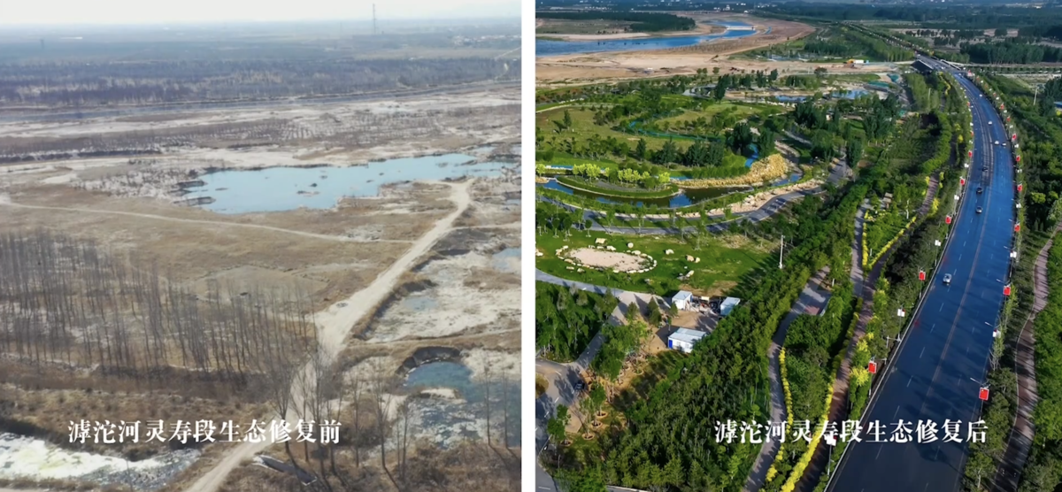 滹沱河靈壽段生態(tài)修復(fù)前后對(duì)比圖。(石家莊市水利局 供圖 )