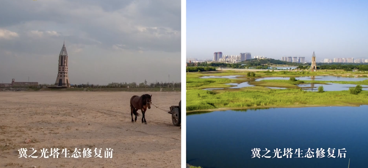 滹沱河塔之光生態(tài)修復(fù)前后對(duì)比圖。(石家莊市水利局 供圖 )