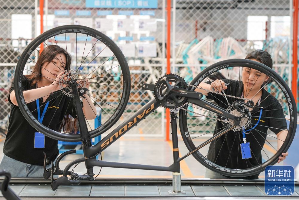 2024年7月8日,在山東泰山瑞豹復(fù)合材料有限公司生產(chǎn)車(chē)間,工人在組裝碳纖維自行車(chē)。位于山東樂(lè)陵經(jīng)濟(jì)開(kāi)發(fā)區(qū)的泰山體育產(chǎn)業(yè)集團(tuán)為2024巴黎奧運(yùn)會(huì)的摔跤、自行車(chē)、跆拳道、體操、田徑等比賽提供器材。新華社記者 朱崢攝
