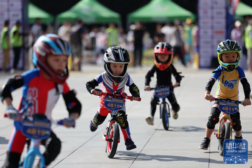 2024年6月22日小選手寒博赟(左二)在比賽中騎行。當(dāng)日,2024甘肅省兒童平衡車(chē)童車(chē)聯(lián)賽在甘肅省蘭州市甘肅大劇院廣場(chǎng)開(kāi)賽。新華社記者 陳斌 攝