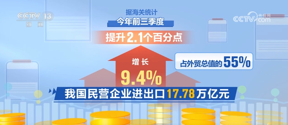 據(jù)海關(guān)統(tǒng)計(jì),今年前三季度,我國民營企業(yè)進(jìn)出口17.78萬億元,增長9.4%,占外貿(mào)總值的55%,提升2.1個(gè)百分點(diǎn);外商投資企業(yè)進(jìn)出口9.53萬億元,增長1.1%,連續(xù)兩個(gè)季度增長;國有企業(yè)進(jìn)出口4.95萬億元,增長0.1%。