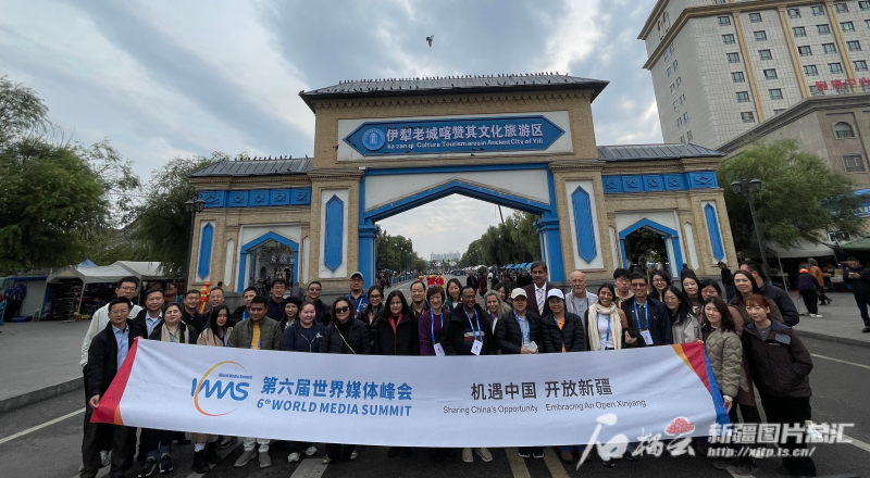 10月15日下午,部分參加第六屆世界媒體峰會(huì)的外媒代表團(tuán)在伊寧市喀贊其文化旅游區(qū)合影。石榴云/新疆日?qǐng)?bào)記者 郭玲 攝
