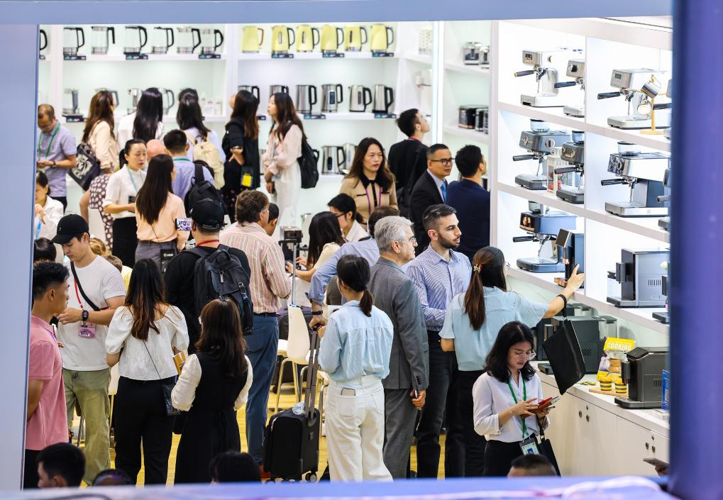 10月15日,境外采購(gòu)商觀看參展企業(yè)家電產(chǎn)品。新華社記者鄧華 攝