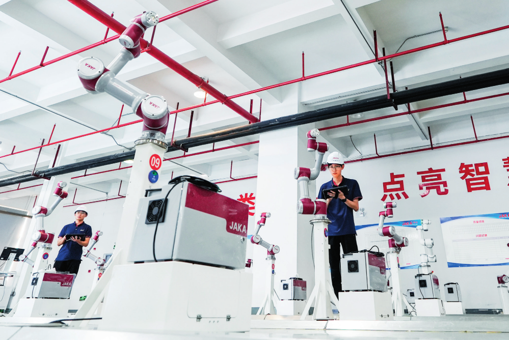 在位于江蘇省常州市武進區(qū)的常州節(jié)卡智能裝備有限公司制造基地,工作人員在對柔性智能協(xié)作機器人進行全系列測試(2024 年 6 月 14 日攝) 李博攝 / 本刊