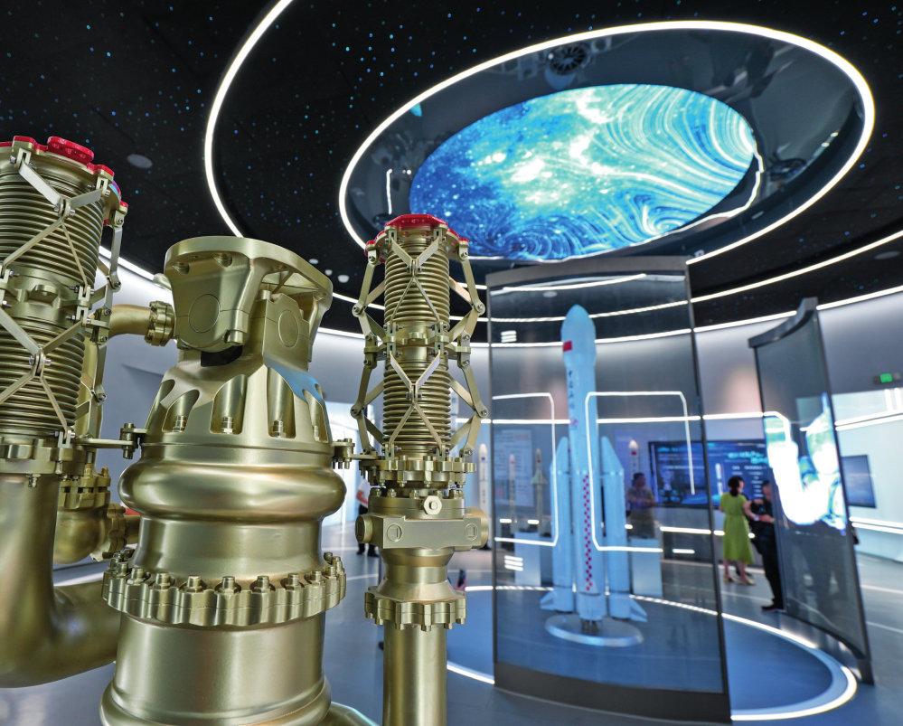 在無錫商業(yè)航天展示館拍攝的火箭發(fā)動機模型(2024 年 9 月 9 日攝) 楊磊攝 / 本刊