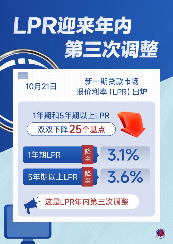 10月21日,新一期貸款市場(chǎng)報(bào)價(jià)利率(LPR)發(fā)布,1年期和5年期以上LPR雙雙下降25個(gè)基點(diǎn),1年期LPR降至3.1%,5年期以上LPR降至3.6%。