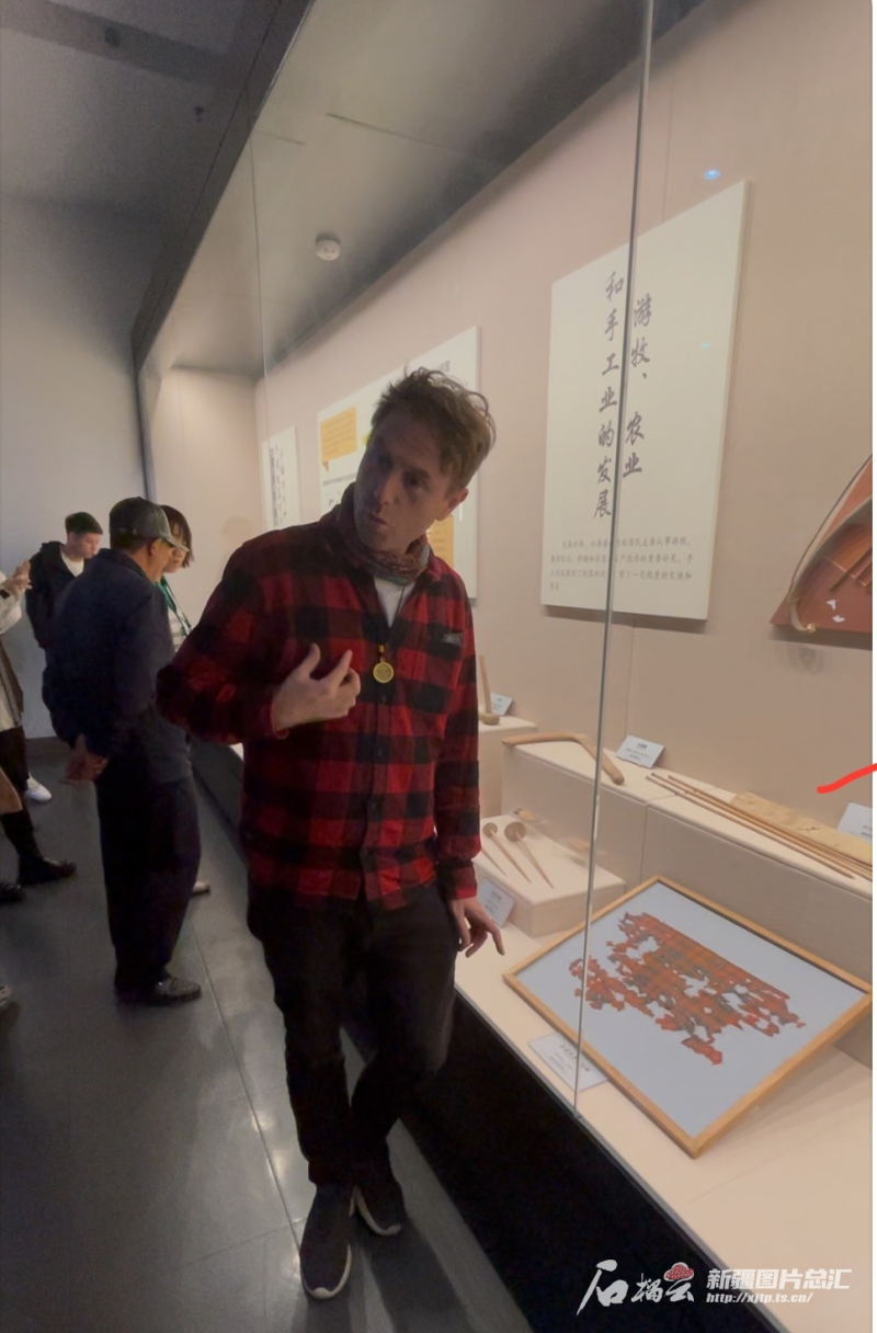 “你們看,這件文物的花紋,跟我的襯衫花紋一樣,古人也很時尚啊!”10月20日,參加“中國有約·相約新疆”2024國際媒體采訪活動的自媒體創(chuàng)作者——來自英國的托比在吐魯番博物館參觀時,指著展示柜的一件文物興奮地說。