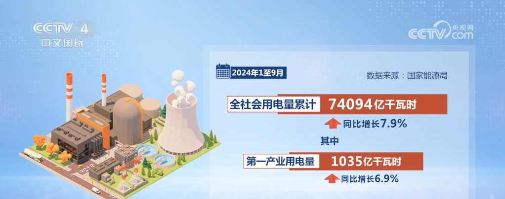數據顯示,今年1至9月,全社會用電量累計74094億千瓦時,同比增長7.9%。其中,第一產業(yè)用電量1035億千瓦時,同比增長6.9%;第二產業(yè)用電量47385億千瓦時,同比增長5.9%;第三產業(yè)用電量13953億千瓦時,同比增長11.2%;城鄉(xiāng)居民生活用電量11721億千瓦時,同比增長12.6%。