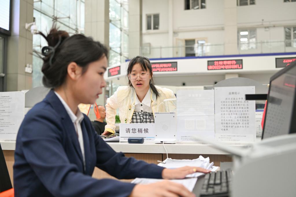 2024年8月12日,在哈爾濱新區(qū)社保綜合服務大廳,工作人員(左)在辦理業(yè)務。新華社記者 王松 攝