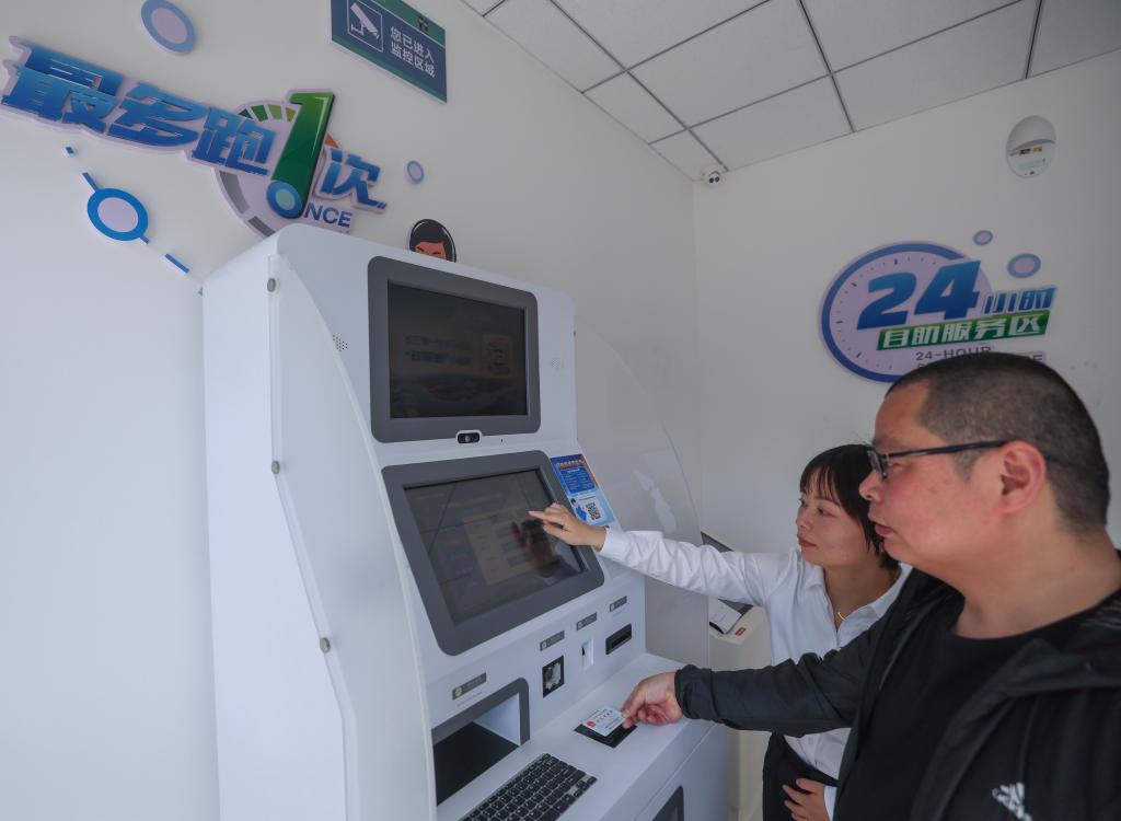 2024年5月9日,在浙江省嘉興市秀洲區(qū)王江涇鎮(zhèn)便民服務中心,工作人員指導居民對在蘇州工作期間的社保繳費記錄進行自助跨省查詢。新華社記者 徐昱 攝