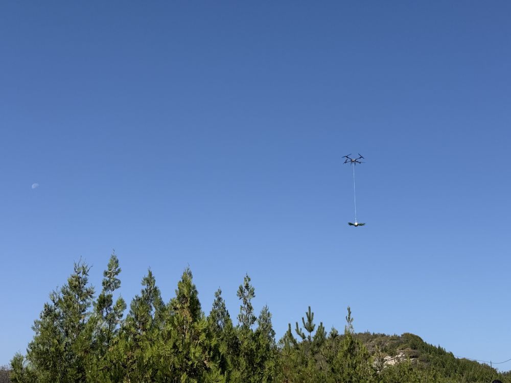 “懸崖造林隊(duì)”隊(duì)員在操作無人機(jī),將樹苗運(yùn)到另一側(cè)山頭。