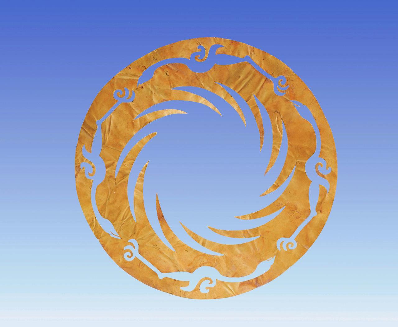 薄薄的一片,斜躺在透明展臺上,緩緩做360度旋轉。它的大小跟一張CD差不多,由含金量高達94.2%的金箔片制作,厚度僅0.02厘米。圖案分為內(nèi)外兩層,外層分布由等距的12條象征太陽的光芒組成,內(nèi)層由4只首尾相接的逆時針飛翔的太陽神鳥組成。整個圖案均衡對稱,充滿動感。