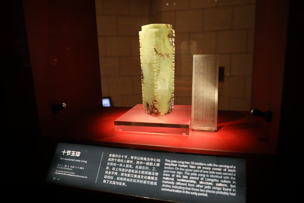 金沙遺址博物館鎮(zhèn)館之寶之一——十節(jié)琮,高22.2厘米,全器分十節(jié),每節(jié)有四個簡化的神人面紋,在上端的一面還陰刻有一神人圖案。這件玉琮的質(zhì)地與金沙遺址的其他玉琮完全不同,其造型風格、紋樣圖案、制作工藝都與長江下游的良渚文化一致,應是早于金沙1000多年的良渚人的產(chǎn)品。圖片由金沙遺址博物館提供