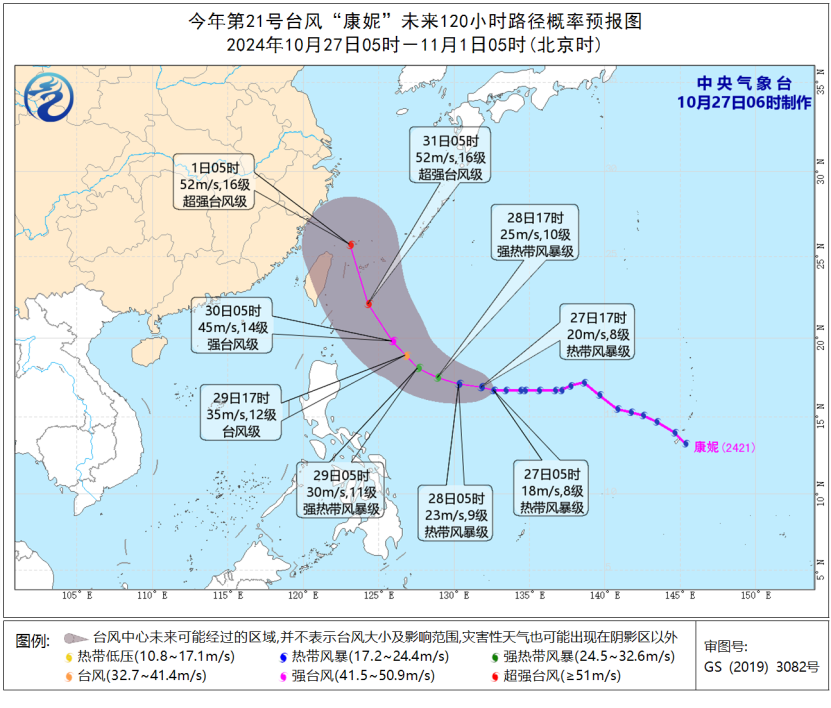 預(yù)計,“康妮”將以每小時10至15公里的速度向偏西方向移動。29日開始轉(zhuǎn)向西北方向移動,逐漸向臺灣島東部海面靠近,強度逐漸增強,最強可達強臺風(fēng)級或超強臺風(fēng)級(48至55米/秒,15至16級)。