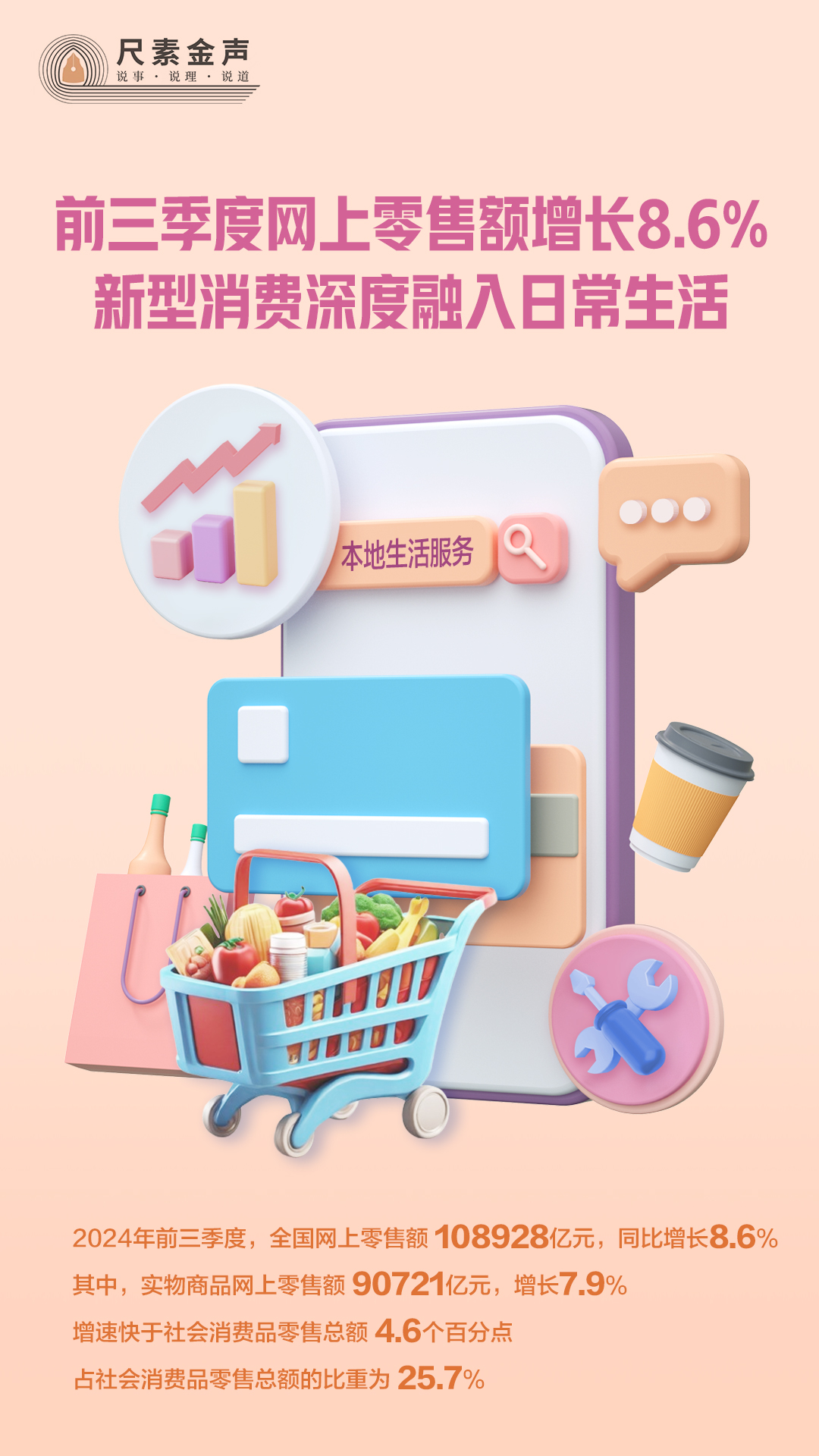 最新數(shù)據(jù)顯示,今年前三季度,全國網(wǎng)上零售額108928億元,同比增長8.6%。其中,實(shí)物商品網(wǎng)上零售額90721億元,增長7.9%,增速快于社會(huì)消費(fèi)品零售總額4.6個(gè)百分點(diǎn),占社會(huì)消費(fèi)品零售總額的比重為25.7%。本地生活服務(wù)等新型消費(fèi)快速增長,對線上消費(fèi)增長起到明顯的拉動(dòng)作用。