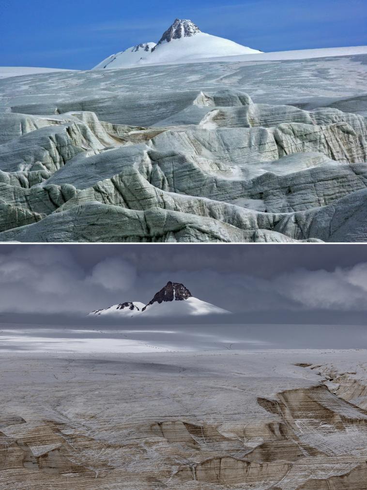 拼版照片:上圖為2009年6月拍攝的普若崗日主峰(新華社發(fā) 車(chē)剛攝);下圖為2024年9月4日拍攝的普若崗日主峰(新華社記者姜帆攝)。對(duì)比可以看出普若崗日主峰下的冰原消融嚴(yán)重。新華社發(fā)