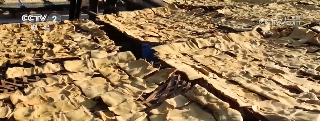 記者走進(jìn)田林縣六隆鎮(zhèn)就聞到濃濃的筍香。經(jīng)過(guò)幾個(gè)月的自然發(fā)酵,扁平、泛白的八渡筍被村民從筍倉(cāng)中取出,在陽(yáng)光下自然晾曬,各家房前屋后鋪滿了金燦燦的八渡筍筍干。