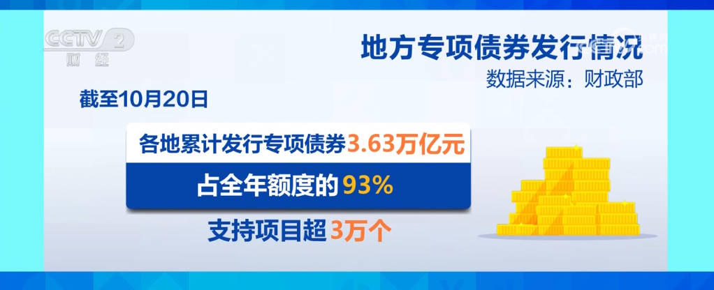 數(shù)據(jù)顯示,9月份,全國(guó)一般公共預(yù)算支出、政府性基金預(yù)算支出同比分別增長(zhǎng)5.2%和34.2%。同時(shí),地方專項(xiàng)債券發(fā)行加速,9月發(fā)行約占全年額度的26%。截至10月20日,各地累計(jì)發(fā)行專項(xiàng)債券3.63萬(wàn)億元,占全年額度的93%,支持項(xiàng)目超3萬(wàn)個(gè)。