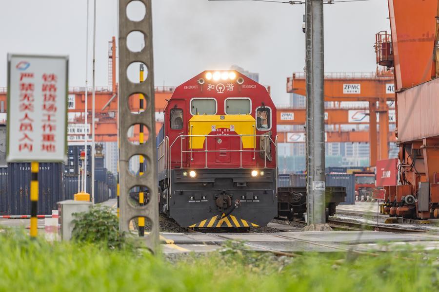 2024年7月30日,在重慶國際物流樞紐園區(qū),一列裝載機(jī)械設(shè)備、汽車和筆記本電腦的中歐班列從重慶團(tuán)結(jié)村中心站駛出。新華社記者 黃偉 攝