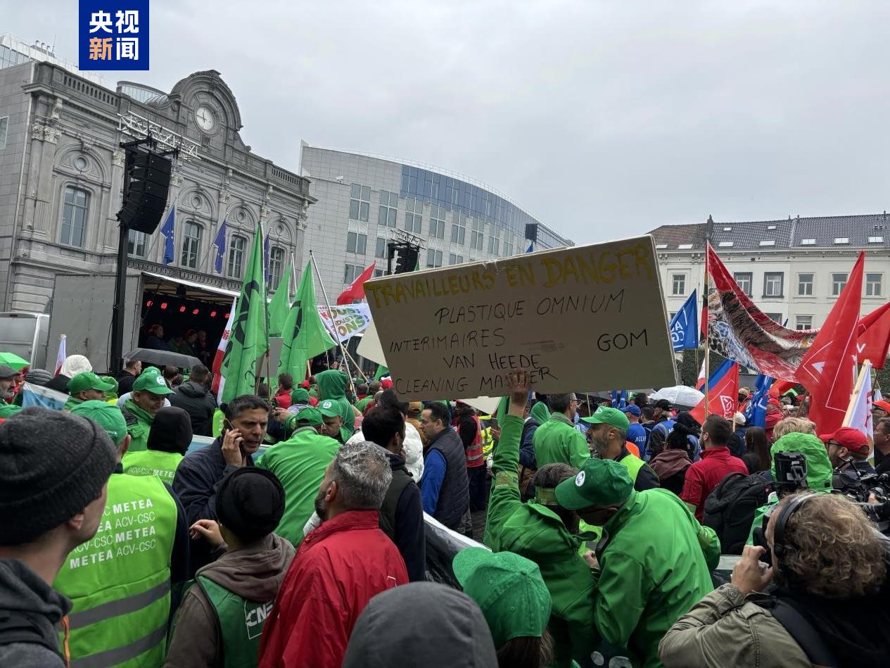9月16日,比利時(shí)一家?jiàn)W迪工廠工人在布魯塞爾市中心的盧森堡廣場(chǎng)舉行示威活動(dòng)(總臺(tái)記者顧鑫拍攝)