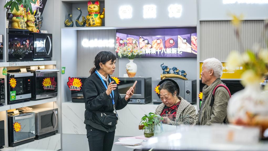 銷售人員在向貴陽市民推介以舊換新商品(10月11日攝)。新華社記者 陶亮 攝