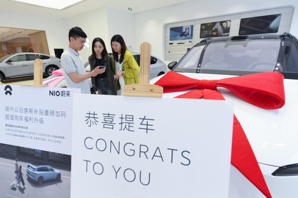 9月24日,在位于湖州市湖東街道的蔚來交付中心,銷售人員向顧客介紹提車后如何申領(lǐng)以舊換新補貼。新華社記者 翁忻旸 攝