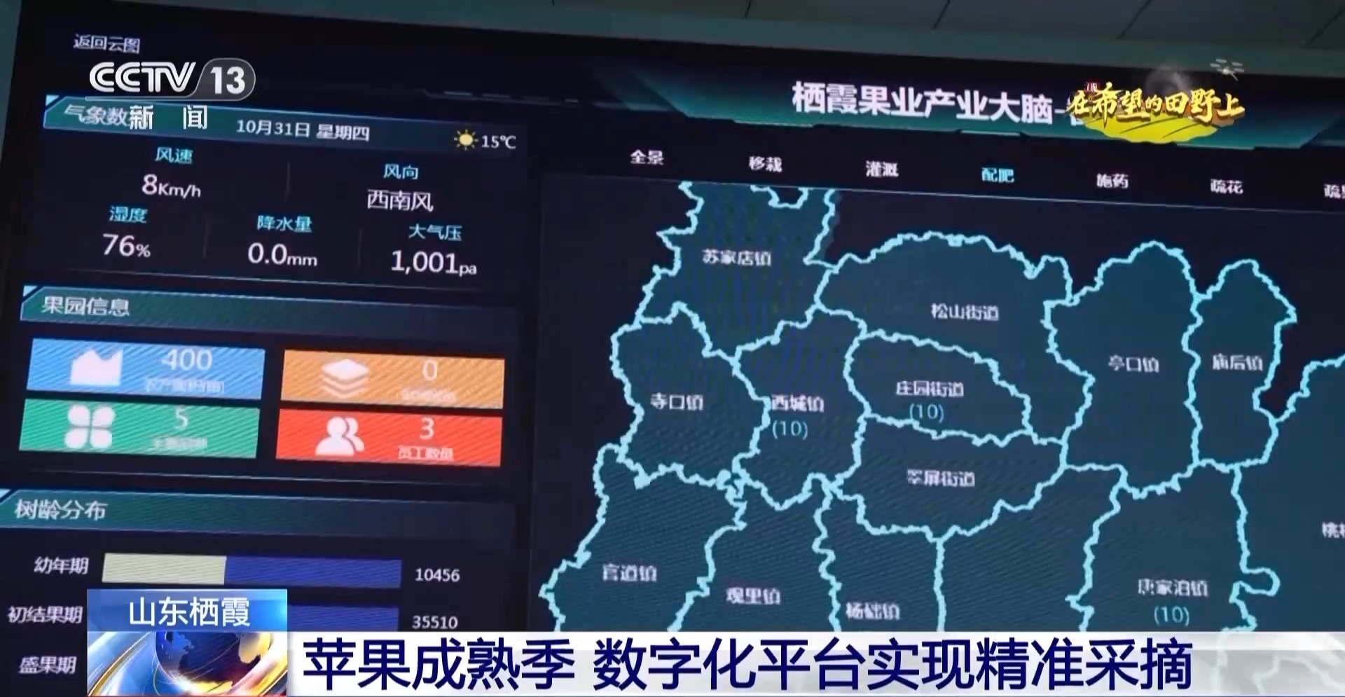棲霞市供銷合作社聯(lián)合社負(fù)責(zé)人 李國勇:通過這個(gè)大屏,我們可以清楚地看到果樹的生長(zhǎng)情況,平臺(tái)也會(huì)將果樹生長(zhǎng)情況相關(guān)信息通報(bào)給果農(nóng)進(jìn)行精準(zhǔn)采摘。