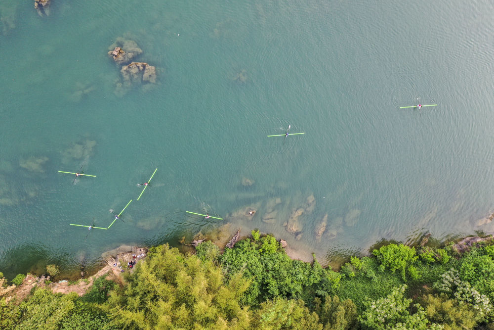 4月9日,河池學(xué)院獨(dú)竹漂隊(duì)的隊(duì)員們?cè)谧匀缓拥览镉?xùn)練。