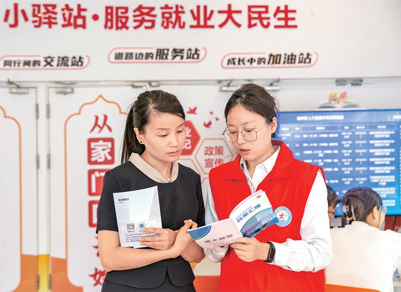 零工市場(chǎng)是向靈活就業(yè)人員與用工主體提供就業(yè)服務(wù)的重要載體。圖為2024年9月3日,江蘇省南通市通州區(qū)萬達(dá)廣場(chǎng)“零工驛站”內(nèi),就業(yè)服務(wù)人員在向求職者介紹就業(yè)創(chuàng)業(yè)政策。人民圖片 翟慧勇/攝