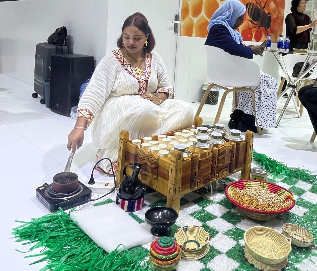 在埃塞俄比亞國(guó)家館展區(qū),埃塞俄比亞咖啡師在現(xiàn)場(chǎng)烘焙咖啡豆,展示當(dāng)?shù)乜Х任幕#ㄊ茉L者供圖)